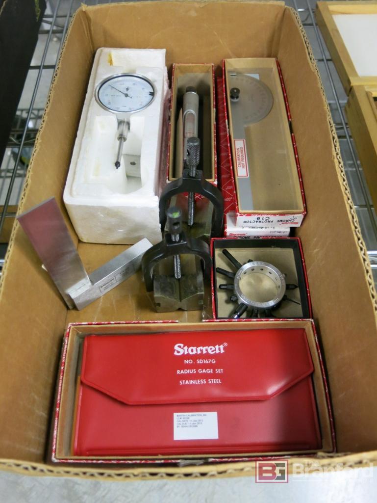 Starrett Radius Gauge Set, (2) V Blocks, (1) Dial Indicator, (1) Mitutoyo Angle Plate, (2) Starrett Protractors, (1) Starrett Precision Machinist Level, (1) Starrett Contact Point Set