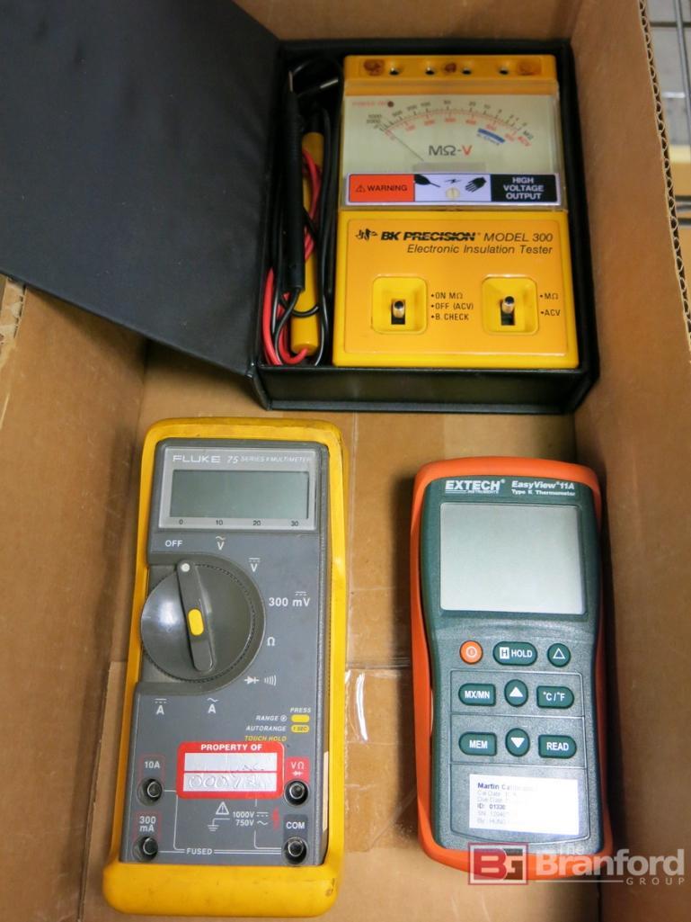 Fluke Model 75 Series Multimeter, Extech EZ View 11A Type K Thermometer, (1) BK Precision Model 300 Electronic Insulation Tester