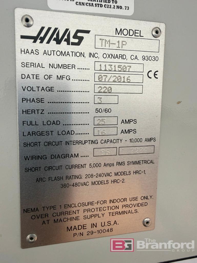 Haas TM-1P CNC Mill; Model: TM-1P; S/N 1131507; Date: 7/2016; Only Run Dry on Aluminum; 10-Tool Changer; VacMagic VM300 Vacuum Fixture Plate