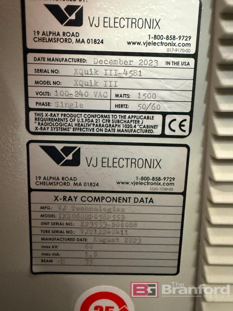 VJ Electronix Xquik III X-Ray Component Counter; Model: XQuik III; AccuCount Software Package automatically "counts" actives and passives on 7" and 15" reels; S/N Xquik III-4581; Date: 12/2023; 60 kV